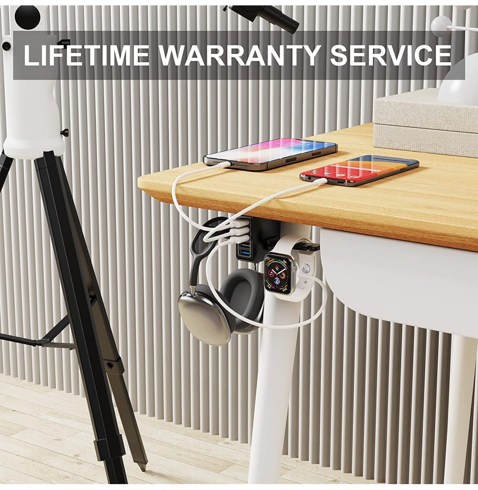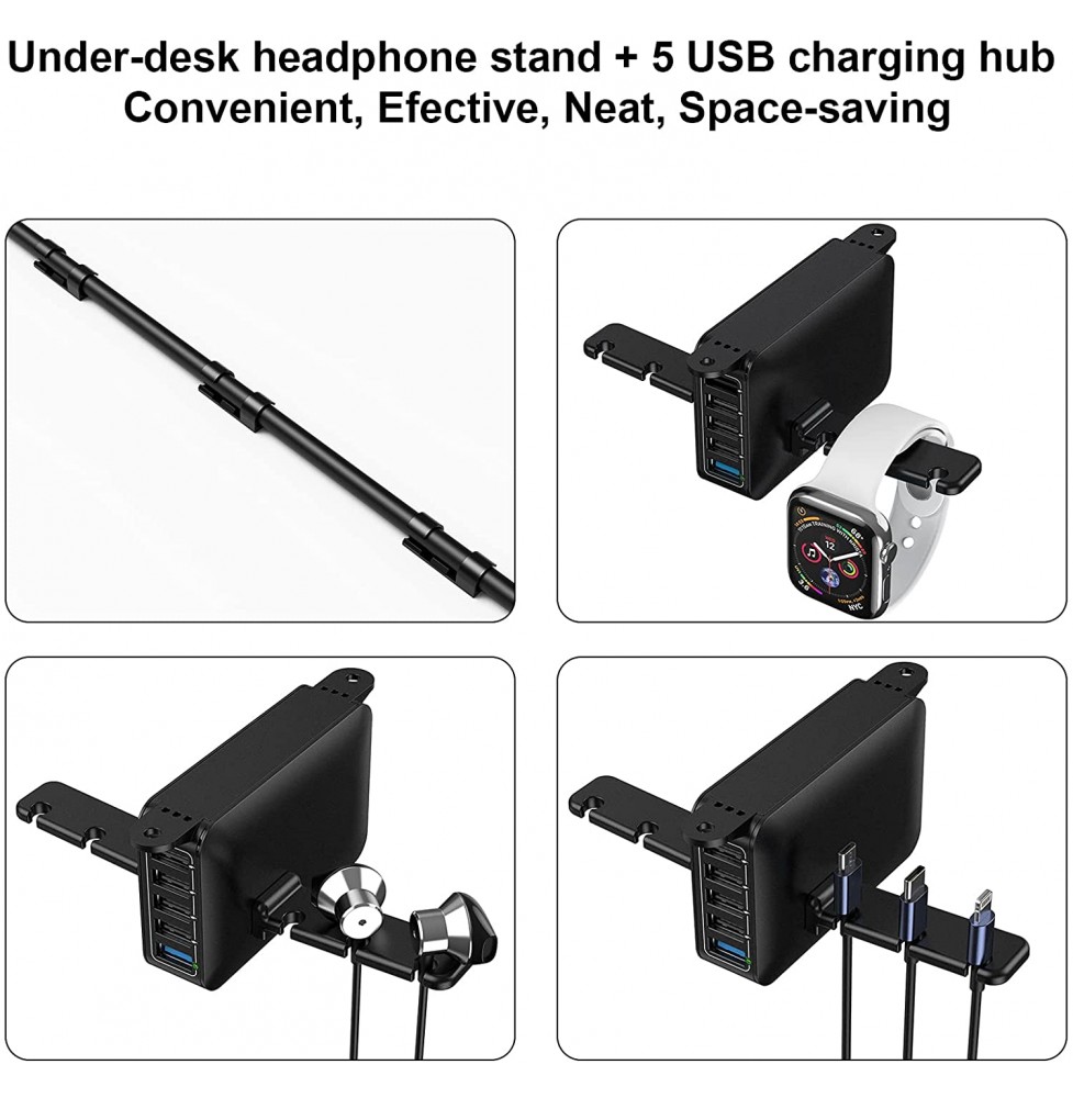 HORUMP Headphone Stand with 5 Port USB Charger, Under Desk Headset Hook Holder Hanger Mount with USB Charging Station and iWatch Stand Smart Watch Charging Dock Dual Earphone Hanger Hook
